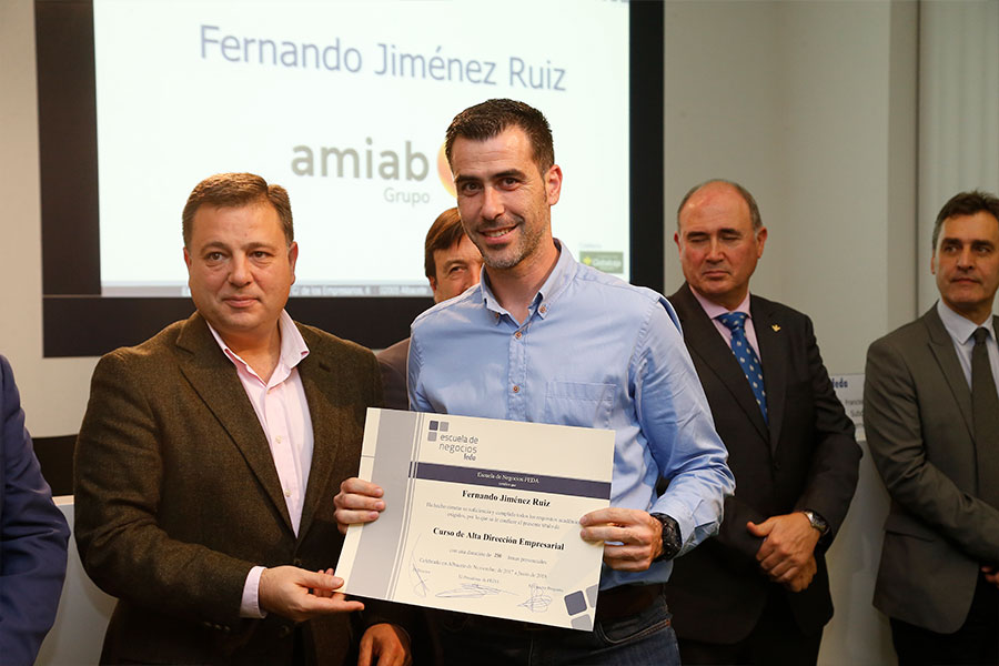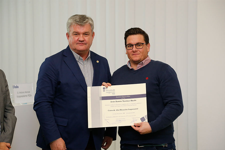 Un total de 15 alumnos han recibido sus diplomas después de finalizar con éxito los programas formativos ofertados desde la Escuela de Negocios FEDA. Nueve alumnos han recogido sus títulos correspondientes al Curso de Alta Dirección Empresarial, CADE (1ª parte del Máster en Dirección y Administración de Empresas MBA Executive), y seis alumnos han recibido el título del Programa Avanzado en Dirección Financiera. En este acto también han estado invitados los 64 alumnos que han asistido al programa ‘Rutas hacia el Éxito’ celebrado en las localidades de Caudete, Villarrobledo, Almansa y La Roda, con una mención especial para todos ellos.